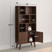 - RETRO BOOKSHELF: Features six open shelves and two door-covered compartments with four 8" long tapered solid wooden legs, brass finished knobs, and a cherry wood laminate finish to showcase a clean mid-century style