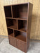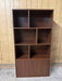 RETRO BOOKSHELF: Features six open shelves and two door-covered compartments with four 8" long tapered solid wooden legs, brass finished knobs, and a cherry wood laminate finish to showcase a clean mid-century style