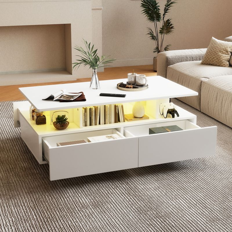 35.4" Modern High Glossy Rectangular Coffee Table with LED Light and Drawers - new