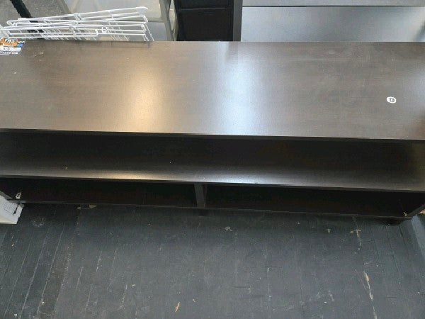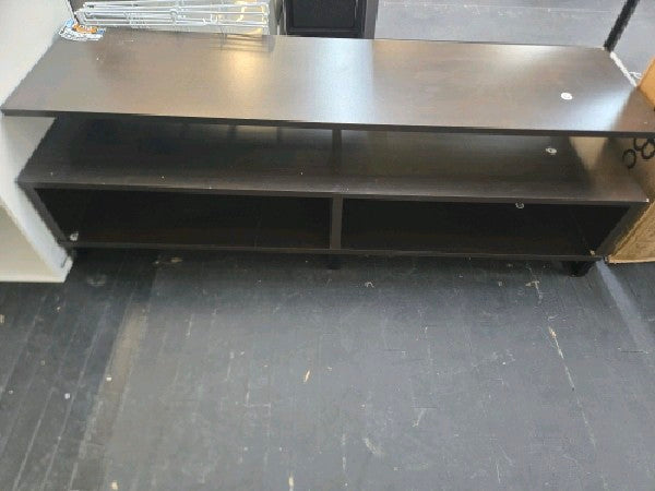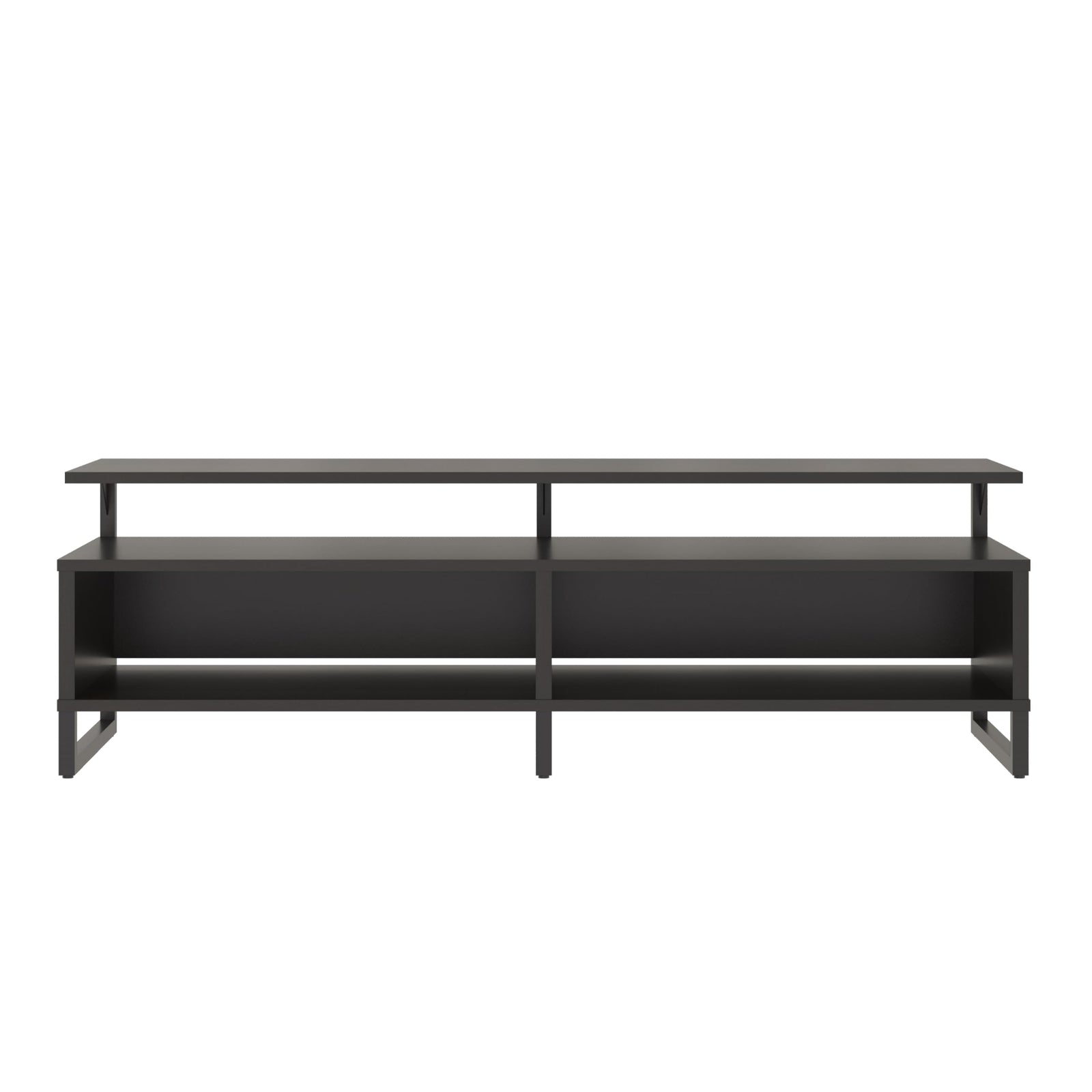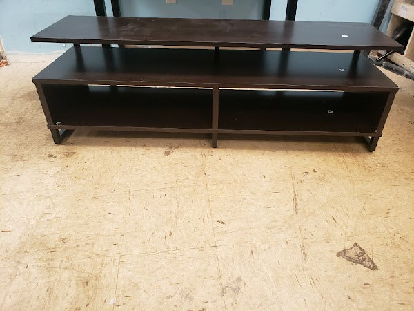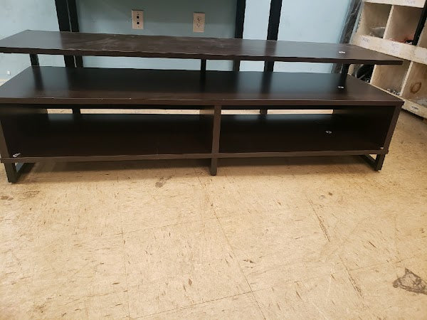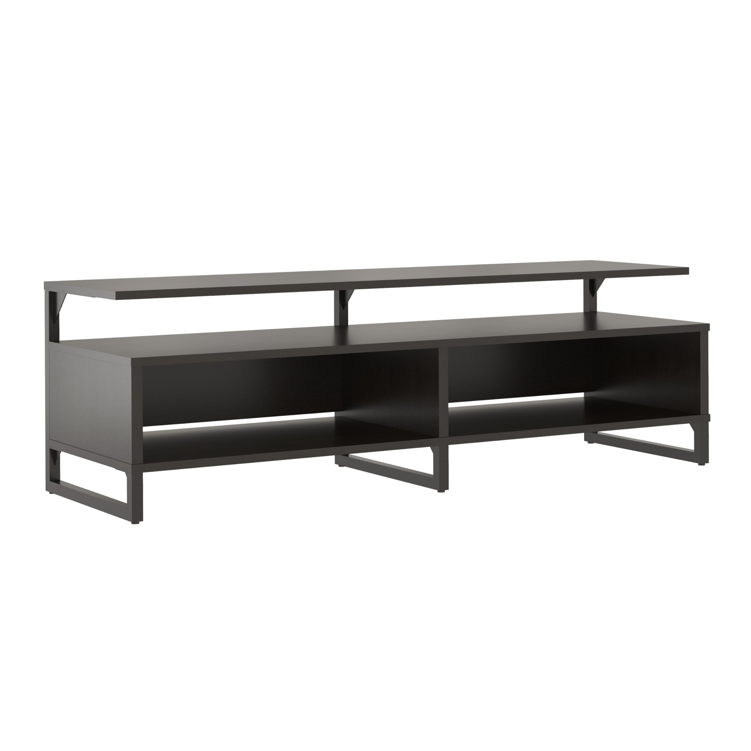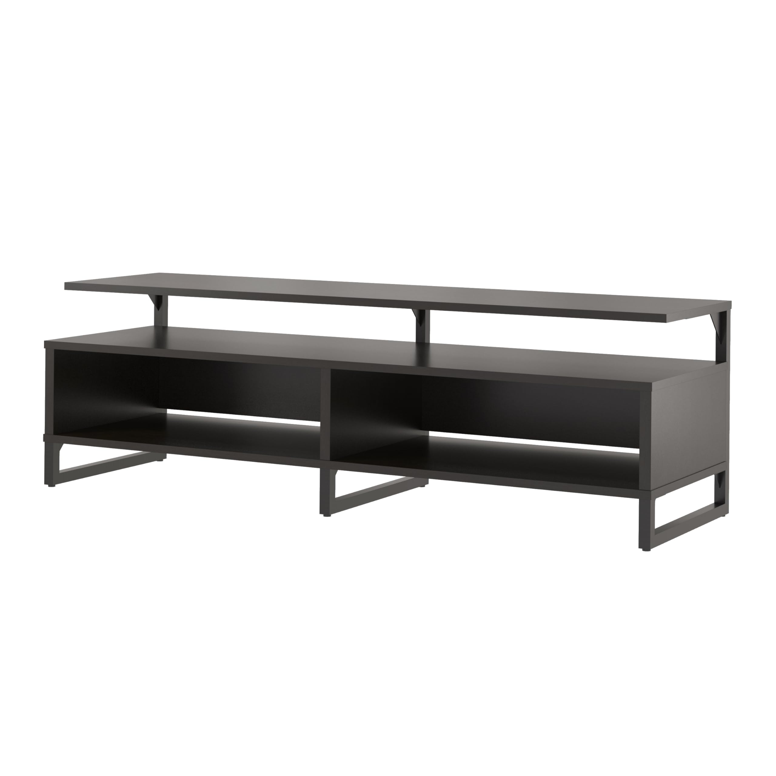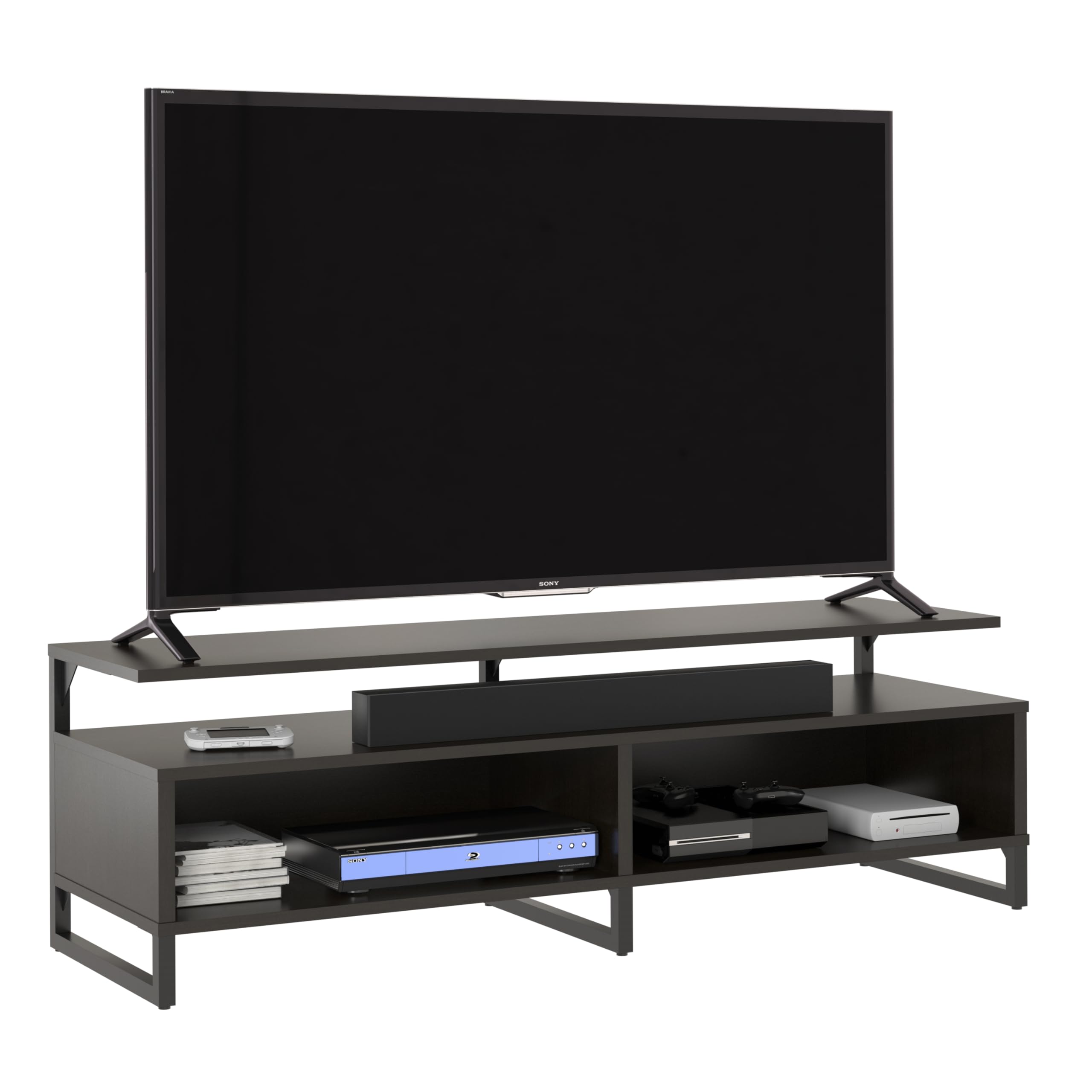 Add a modern feel to your living room or man cave with the Ameriwood Home Whitby TV Stand. The Stand accommodates most flat screen TVs up to 65” wide or 120 lbs. The espresso finish on the laminated particleboard pairs with the black powder-coated metal frame for a classic look. The floating shelf design adds a unique look your guests will talk about. The large middle shelf is perfect for a sound bar or gaming systems and features an open concept to provide proper air circulation and easy access to outlets. The 2 open cubbies provide storage for your cable box, DVD player, and games. The wire cutouts keep cords organized and tangle free. The low profile adds stability to the Stand and keeps your TV at eye level so you always get the right angle when you are watching the game or binge-watching Netflix. The TV Stand ships flat to your door and 2 adults are recommended to assemble. Once assembled, the Stand measures to be 18.6”H x 59.6”W x 18.7”D.