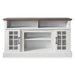 A classic TV table unit with intricate detailing that blends rustic design with modern elements. Contoured edges and patterned cabinet doors lend a decorative appeal. The tabletop can fit a TV of up to 65 inches. Cable cutouts keep your wires well-organized and clutter-free. There are two adjustable shelves, two cubbies, and two enclosed cabinets. The open shelves are great for displaying your favorite decor pieces while the closed cabinets can accommodate larger items.