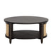 The dark, smooth surface of this modern coffee table provides ample room to store and display an array of items, such as a stack of books, the TV remote, a big bowl of snacks or an ice-cold beverage. With curved side panels made of a synthetic decorative caning insert, this round coffee table from the Better Homes & Gardens® Springwood Collection encompasses a sophisticated yet homey aesthetic. The bottom shelf is the perfect place for stacks of magazines, board games, or to stash away a basket of snacks. This black coffee table with rattan is embellished on both sides with contrasting nature-like fibers, which are a soothing and timeless fashion statement. This coffee table with open storage is finished on all sides in dark Charcoal for versatile placement throughout any room in your home. With plenty of space for both storage and display, this open shelf coffee table lends a chic styling that is bold, dramatic, and just plain fashionable.