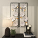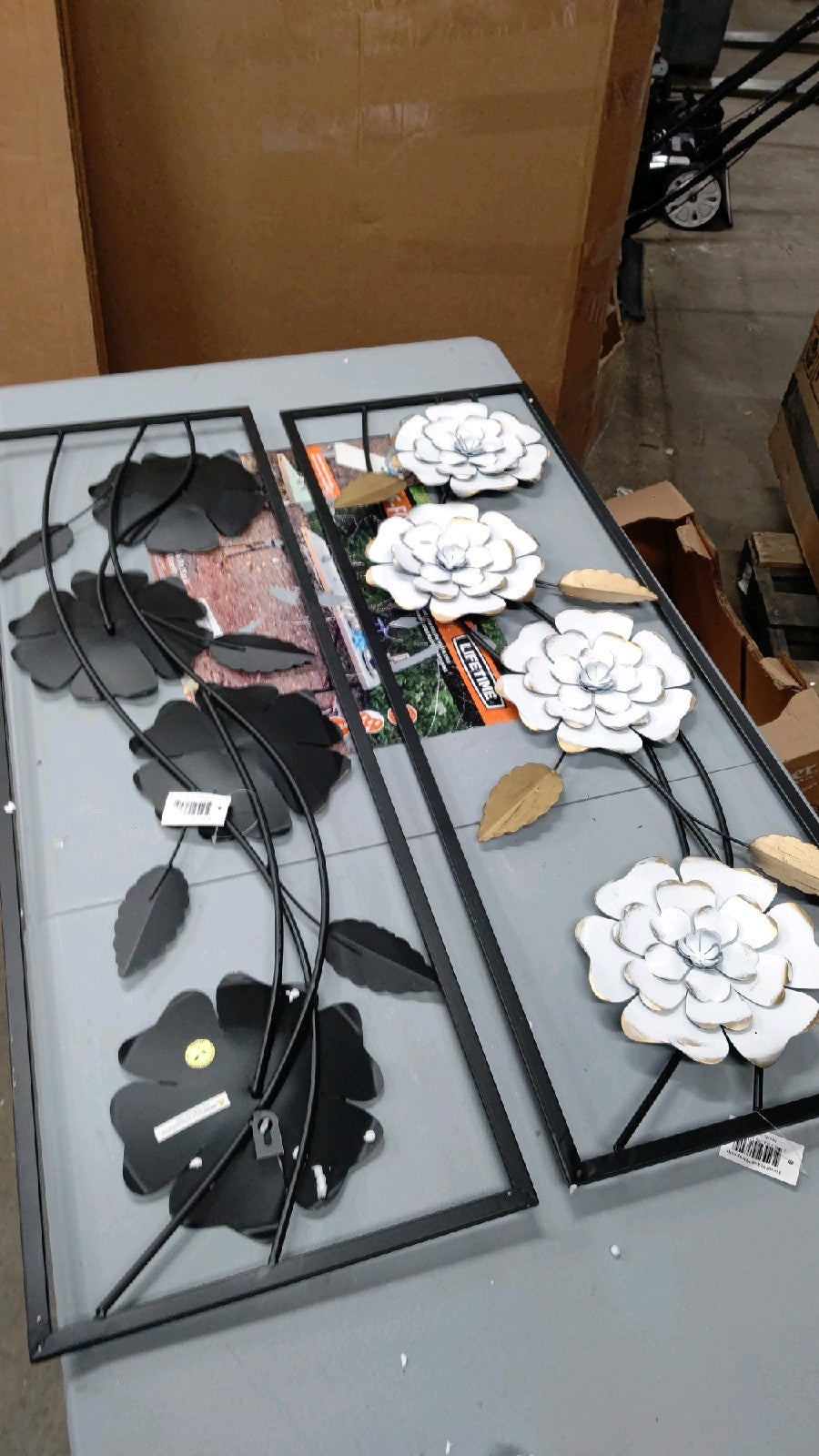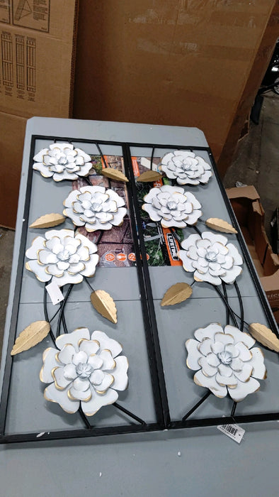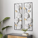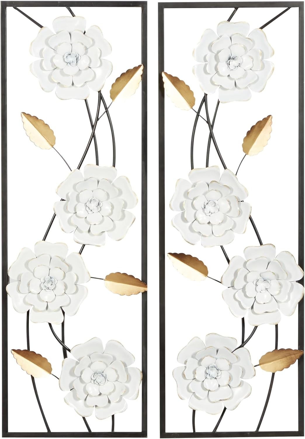 Each piece of this contemporary set of 2 room wall decors is meticulously crafted, featuring welded metal with backing hardware and frame. Polished white wall art set for living room is characterized by its vertical orientation, enhancing the rectangle shape and design of the border flowers wall décor. Wipe clean with a dry cloth. Whether hung together on one wall or used separately to add dimension to hallways, this floral set of 2 wall sculptures is versatile and adaptable. This item ships in 1 carton. Can be hung vertically using the keyholes; nails and screws not included. Suitable for indoor use only. This item ships fully assembled in one piece. This white colored iron wall sculptures comes as a set of 2. Contemporary style.