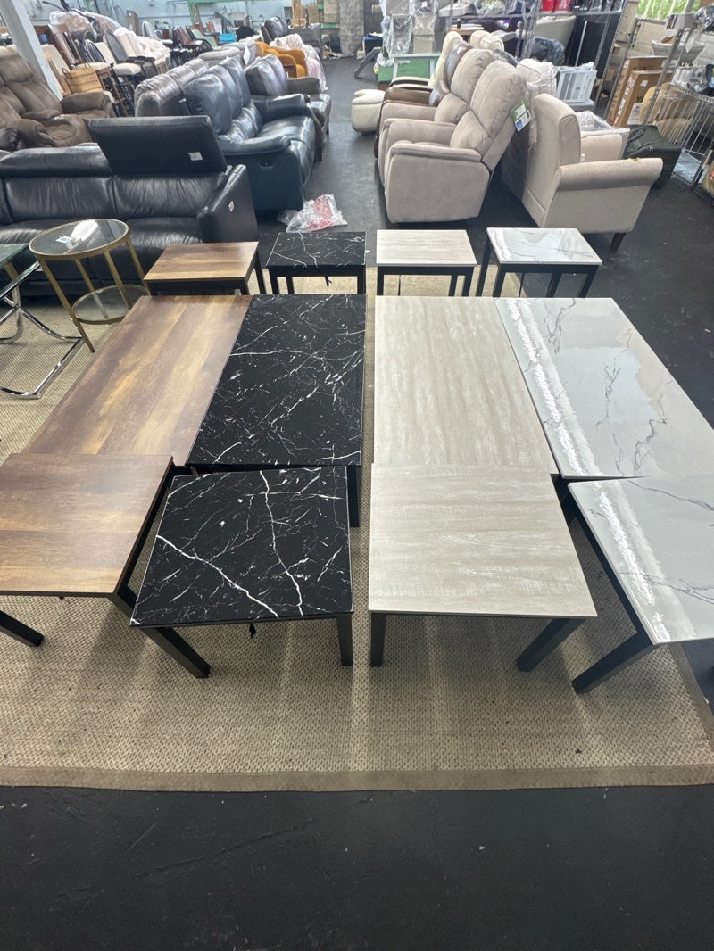 FM42900LG-3PK 3 pc Findlay black finish wood faux wood finish top coffee and end table set. The set contains 1 - coffee table and 2 - end table. Coffee table measures 47.5" x 24" x 16" H. End table measures 18.5" x 21" x 19" H. Some Assembly Required.