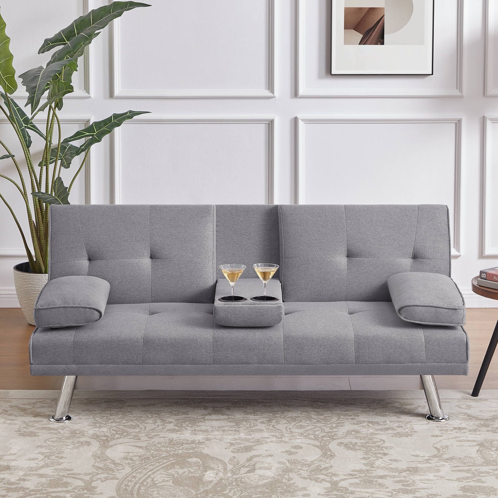 -Futon Sofa bed, can be converted to a fully functioning futon sleeper in few seconds, it is an excellent option for your home, office, and guest room. -Multi-functional design: The backrest has 3 adjustable positions , and converted into a sleeping bed. Perfect for unexpected overnight guests, or just a handy spot for a nap. Also perfect for small spaces. -Featuring a velvet back, square arms, and metal legs, this sofa showcases a clean-lined silhouette perfect for adding a modern touch to any living ensemble,for adult. -The split-back design of this convertible sofa is made to offer each guest their own level of comfort, from sitting up to lounging back. You can even lay flat both the seat and back cushions to create a comfortable place. -Middle back can be put down and with built-in two cup holders.