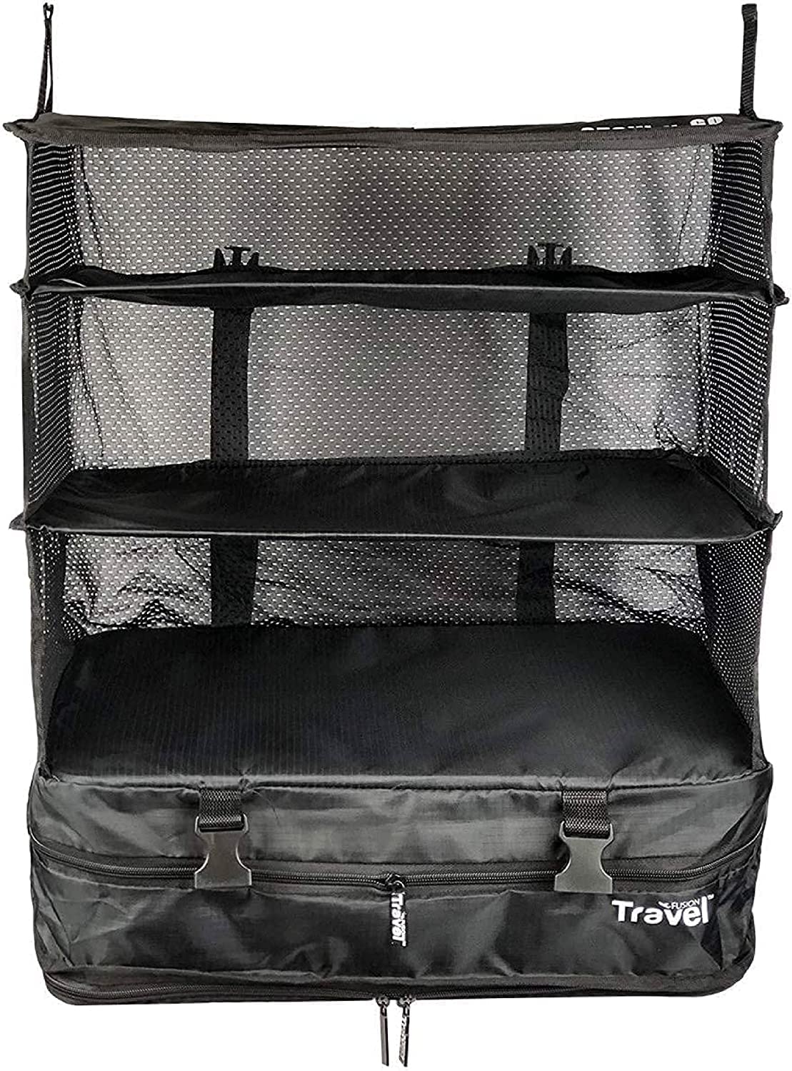 Grand Fusion Stow-N-Go Portable Hanging Travel Shelves, Packing Organizer for Luggage. Carry on Closet with Hanger for Clothes. Expandable Packing Cube. Travel Essentials from Large, Black -