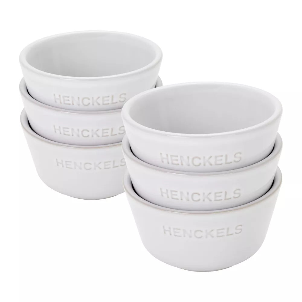 This handy set features 6 x 7-ounce ramekins ideal for holding prep ingredients, serving dips and treats, and baking off individual servings. Use the ramekins to organize yourself by portioning out recipe ingredients before you start cooking. Scoop guac and salsa into these ramekins to offer with a big bowl of chips. Or serve personal portions of mac and cheese and corn bread to your dinner guests.These handmade stoneware pieces are highly resistant to thermal shock, gently retain heat, and are incredibly moisture resistant, offering remarkable durability. Thanks to their beautiful highly scratch-resistant vitreous glaze, you can take them straight to the table for a beautiful presentation. And when the meal is over, they stack neatly and safely for compact storage. Oven safe to 572°F, these versatile ramekins are also microwave, dishwasher, and freezer safe.HENCKELS is committed to sustainability. The unique firing process used to make HENCKELS ceramics results in an eco-friendly, energy saving production.