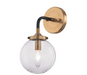 The Boudreaux collection showcases a retro design with a Matte Black-Antique Gold finished framework and clear glass globes that provide crisp light. This simple restoration style sconce is carefully constructed of metal and glass. Product intended for indoor use only.