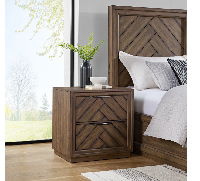 The Soho Nightstand features a brown Oak finish that adds a natural and charming touch to any bedroom setting. It has two storage drawers with English dovetail joinery and soft close undermount glides. The back of the nightstand also features 2 USB and 2 regular ports for additional power sources.