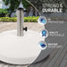 Set up this free-standing umbrella base on your patio or at any outdoor event without worry. The US Weight 80 lbs. Free Standing Umbrella Base is crafted with a high-density polyethylene shell with UV protection that will not dent, or fade, and can withstand the elements in any weather climate. This heavy and stable base was prefilled with 80 lbs. of high-strength concrete. Easily transport and setup the base with the removable wheel on bottom and hand grips for easier mobility. The 20.5 in. Dia base features a 14 in. high stem that accommodates poles from 11/2 in. through 2 in. thick. Inside the stem is a plastic post protector for the umbrella to rest on instead of a screw leaving the pole undamaged. The stem features 2 knobs made of polypropylene that tighten the umbrella securely in place for added stability and support. All of the steel components are made of grade 304 stainless steel. Grade 304 stainless steel is also used in aerospace engineering and surgical instruments.