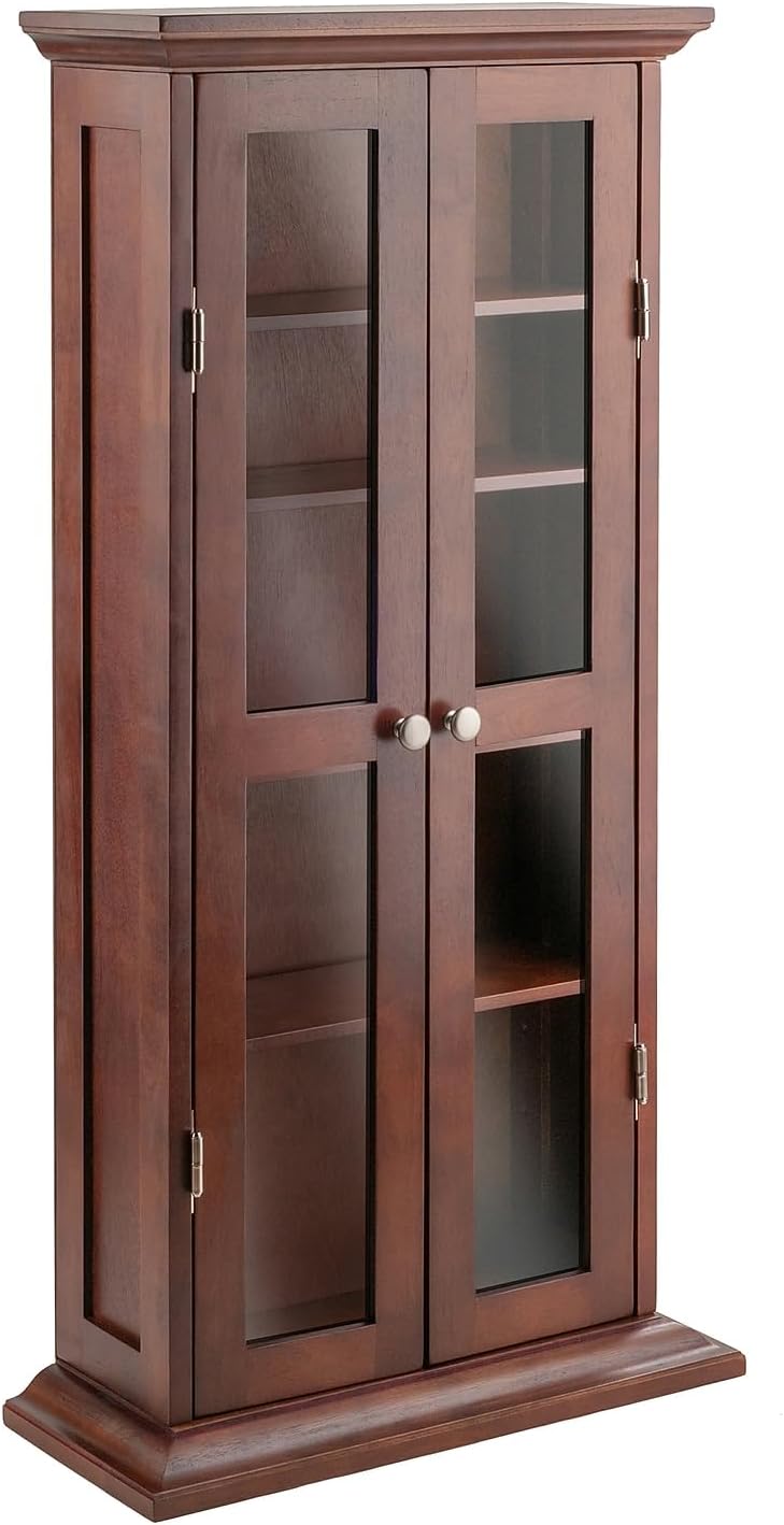 The family entertainment area can look just as handsome as the rest of the house with the help Winsome Wood's CD/DVD cabinet. Featuring a stained Antique Walnut wood finish and double glass doors, this classically styled unit presents itself as an attractive furniture piece rather than simple storage. Yet it's really a hard worker--inside, five adjustable shelves safely and efficiently hold large collections of movies, video games, and music. Simply pull the satin nickel door handles and everything is displayed with no need to shuffle through or dig in the back for a long-lost favorite. The cabinet measures 22 inches wide by 9-1/4 inches deep by 44-1/4 inches high. Assembly is required. --Kara Karll